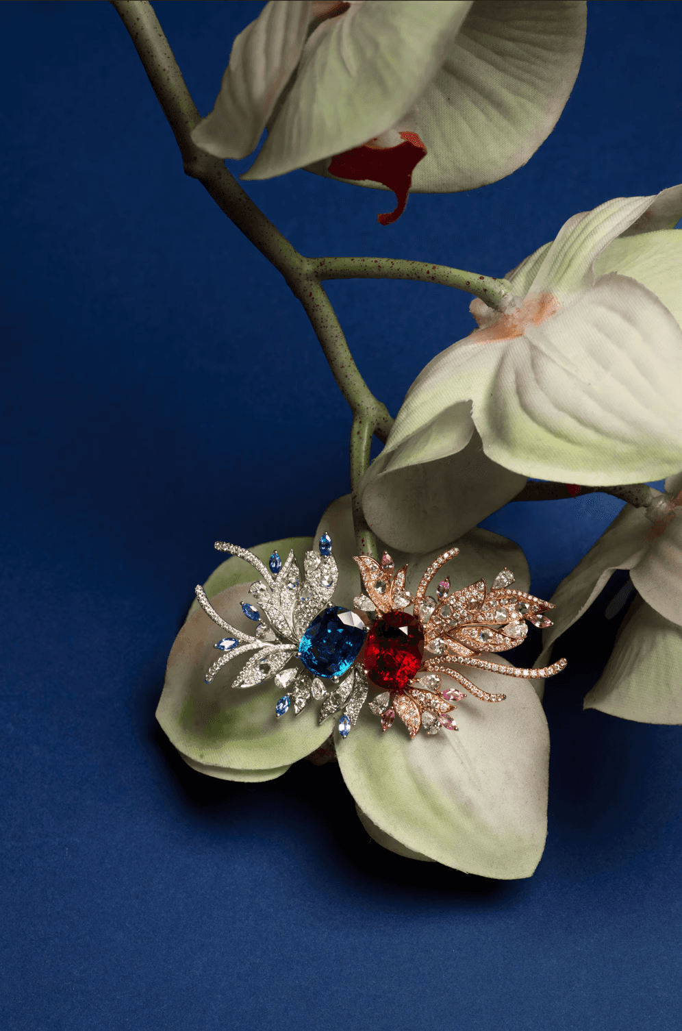 At its heart lies a vivid blue tanzanite, cradled in a flourish of rose-cut and brilliant-cut diamonds, accented by pink sapphires and mosaic pavé— each element thoughtfully chosen to echo the grace and metamorphosis of Psyche herself.